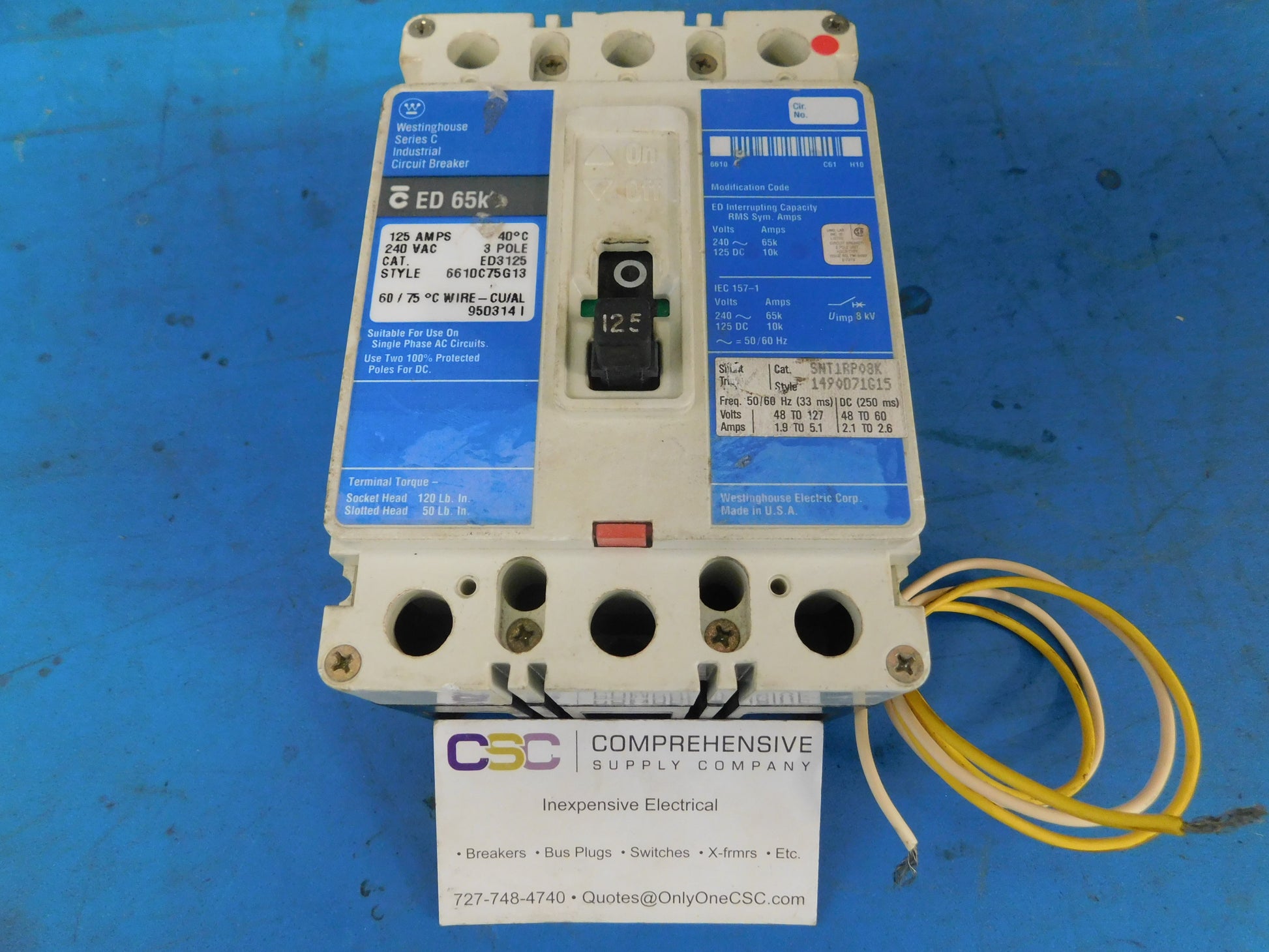 ED3125 - Westinghouse 125A Amp 3P Pole 65kA@240V Feed Through Circuit Breaker W/Blue Label & Shunt Trip